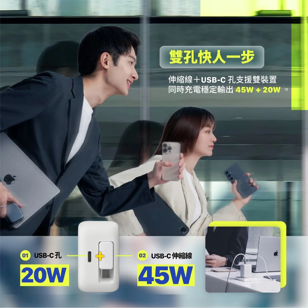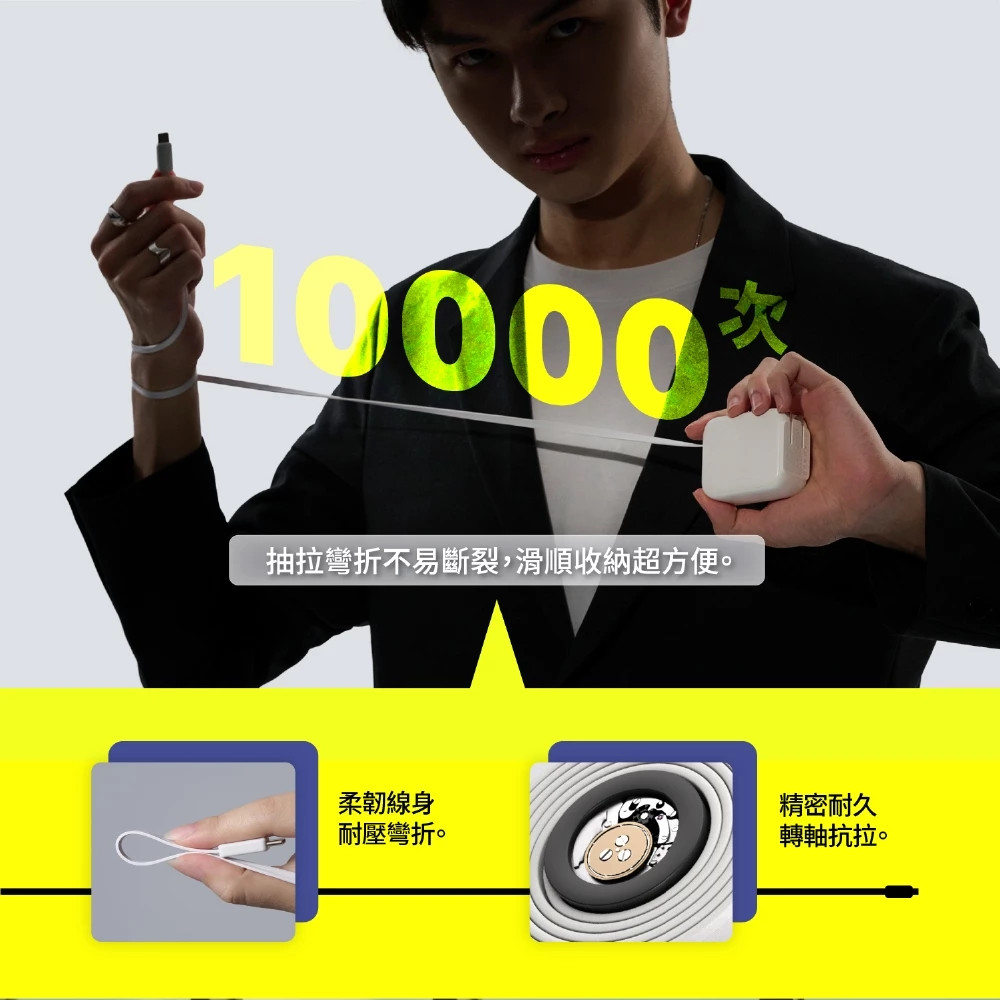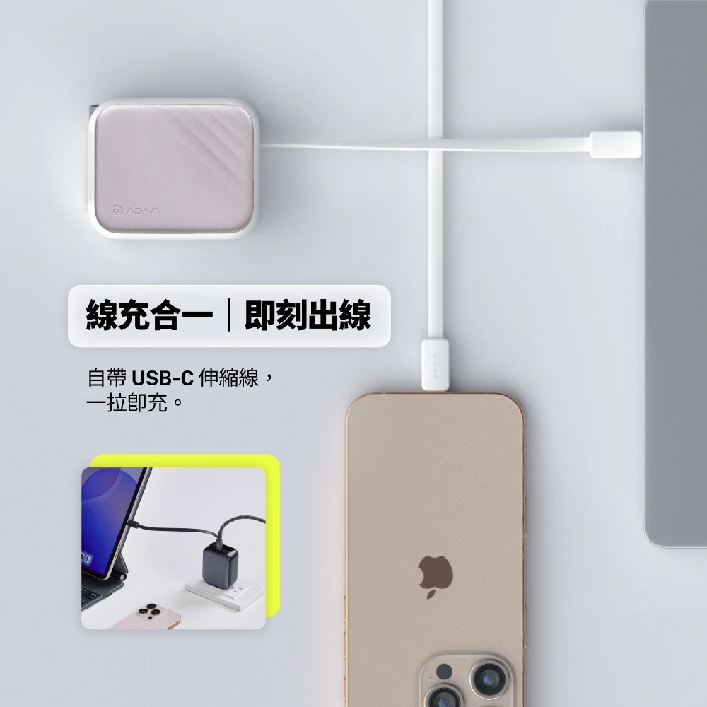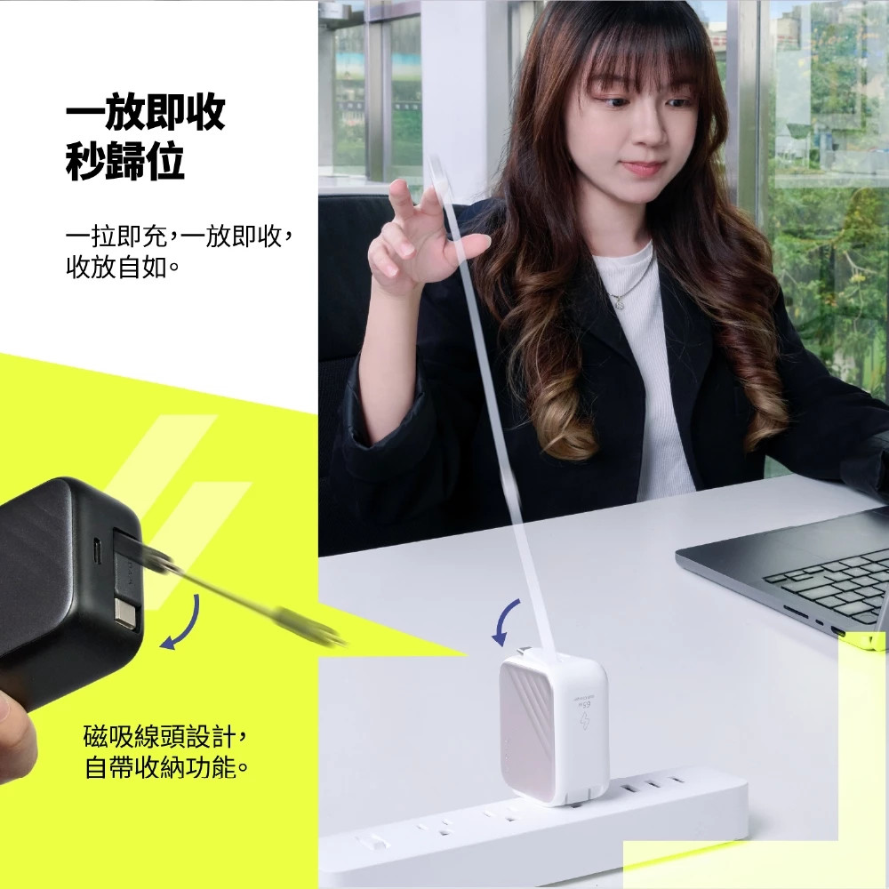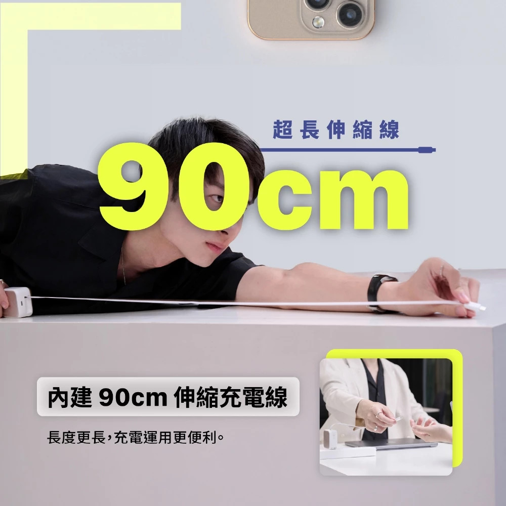 ▲ 內建 90 公分 USB-C 伸縮線,磁吸式抽取線材設計隨拉隨用、收回不打結,隨時整齊好收納,出門少帶一條線更輕鬆。