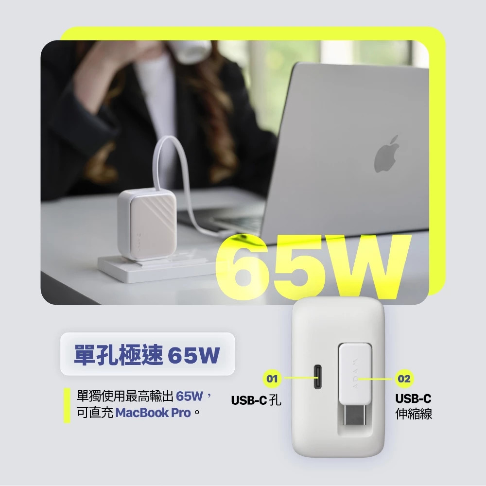 ▲ USB-C最高輸出65W,支援雙裝置同時充電,也支援 PD3.0 / PPS / QC3.0 快充協議,快速為 iPhone、iPad、MacBook Series 等裝置補足電力。