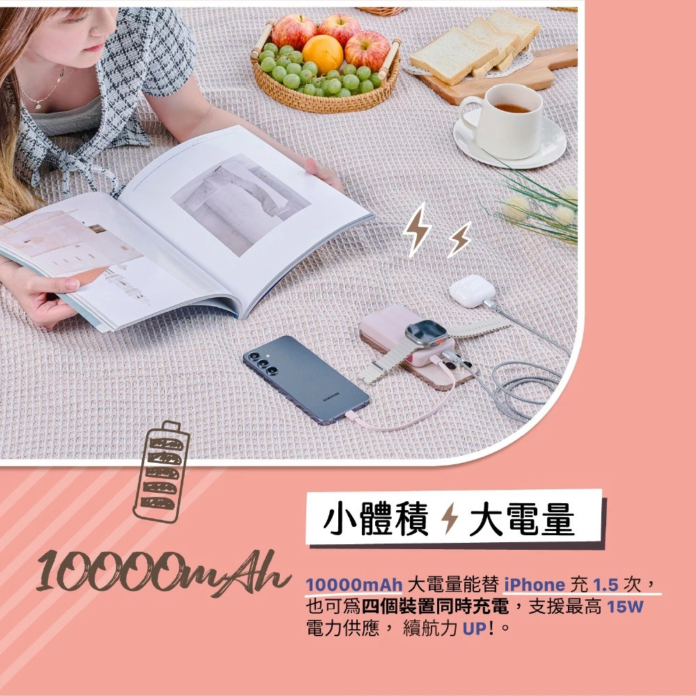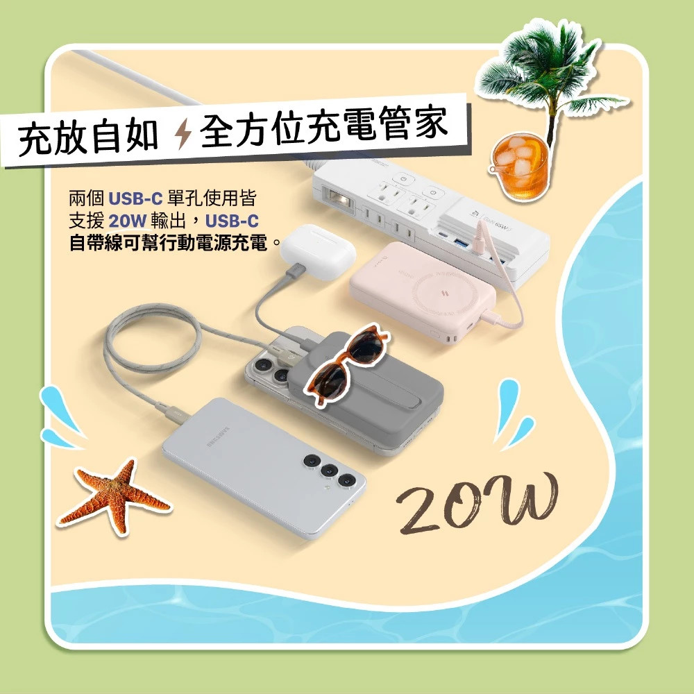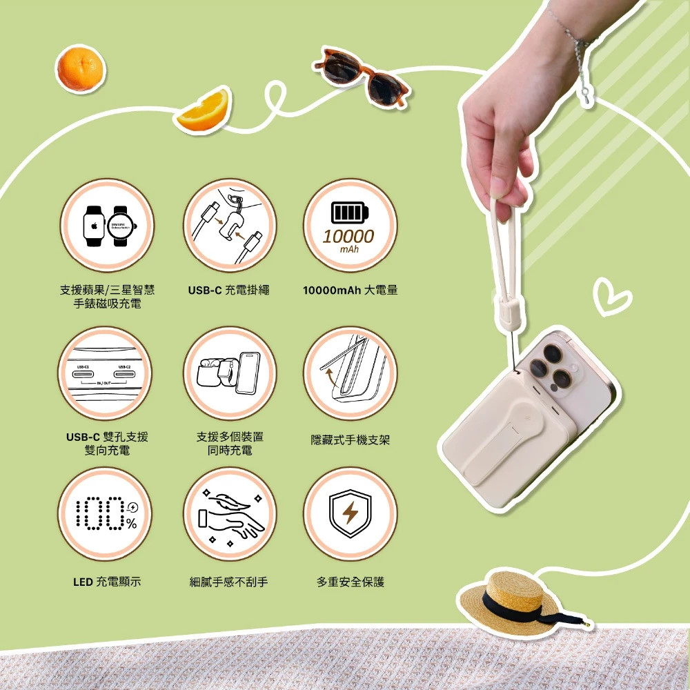 ︎ 內建10000mAh行動電源,雙USB-C 輸出,單孔最高支援20W,隨附吊飾造型USB-C線材,外出攜帶簡單輕鬆。